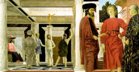 La flagellazione conservata alla Galleria Nazionale delle Marche rappresentò davvero un enigma per gli studiosi di Piero della Francesca. Quel soggetto diffusissimo, con Cristo sullo sfondo angariato da due impietosi sgherri, che usano pari violenza a quella vista nel celebre film di Mel Gibson, lo ritroviamo copiosamente nelle chiese e nei musei. Ma nell’opera in questione i critici hanno sempre avuto il dubbio che la flagellazione, posta nel dipinto su un piano prospettico diverso da quello delle tre figure che campeggiano invece nel proscenio sulla destra, valga a depistare l’osservatore in funzione dell’enigmatica rappresentazione di fatti più vicini all’epoca di Piero, che non a quella di Cristo.
